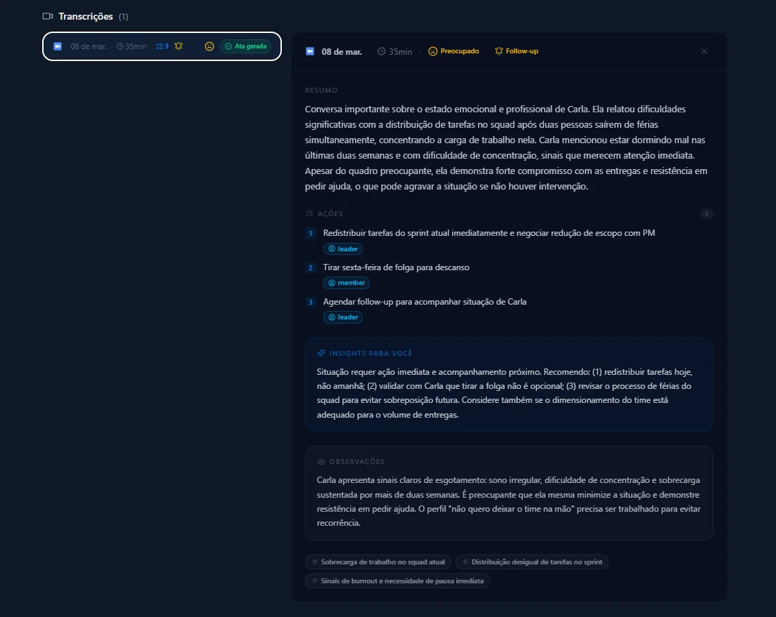 “Antes de cada 1:1 eu consulto o histórico e já sei exatamente o que foi combinado, o que evoluiu e onde preciso dar mais atenção. A conversa rende muito mais quando você chega com esse nível de contexto.”